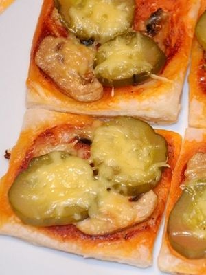 - Graisser la pâte préparée avec de la purée de tomates et y déposer la moitié des concombres et des champignons hachés.