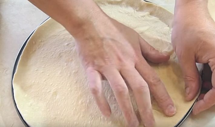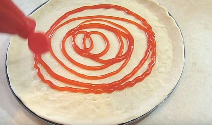 - Répartissez la pâte avec une couche épaisse sur une plaque à pâtisserie et graissez-la avec de la purée de tomates.