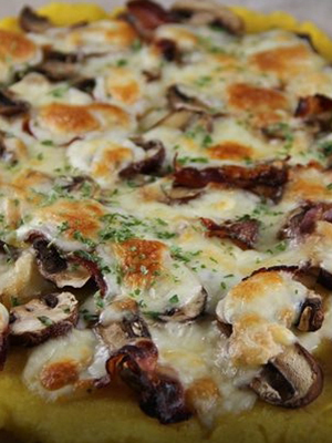 La pizza appelée César au jambon et aux champignons est cuite à l'aide de cette technologie. Couper la viande en fines tranches, faire revenir les champignons, préalablement les peler et les couper en petits cubes. Faites une sauce à base d'huile d'olive, d'ail (haché finement), de jaune de poulet et de parmesan râpé.