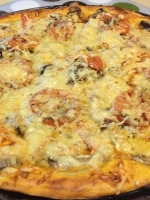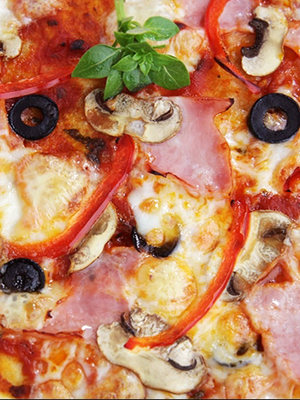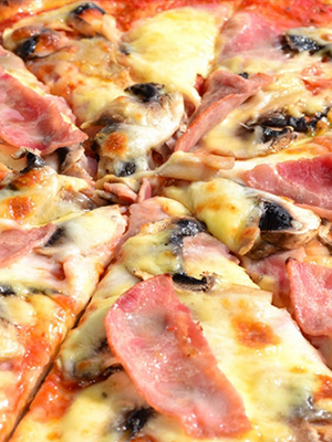 Pizza au jambon, champignons marinés et fromage