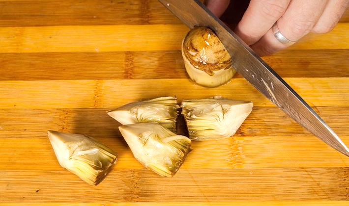 Libérez les artichauts des feuilles et coupez-les en tranches qu'ils mettent dans de l'eau avec du jus de citron afin qu'ils ne noircissent pas.