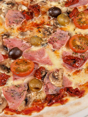 Pizza César au jambon, champignons et tomates cerises