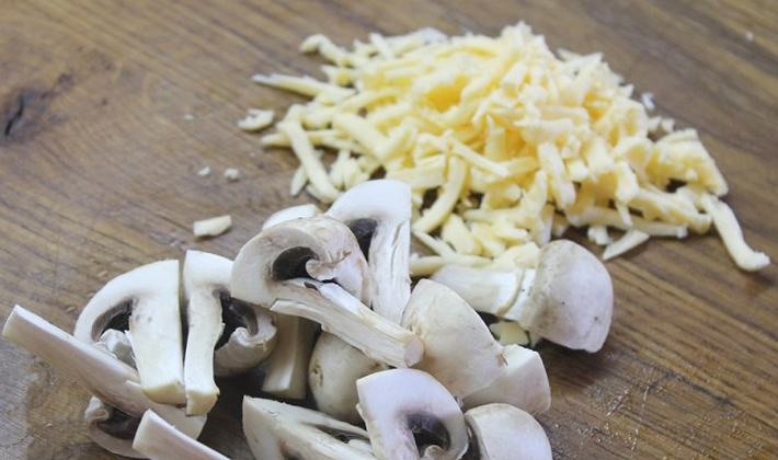 Si la pâte était au congélateur, vous devez l'extraire pour la décongeler et pendant ce temps préparer les composants pour le remplissage. Tomates et saucisses doivent être coupées en triangles, égoutter la marinade des champignons et les hacher. Hacher finement les verts et râper le fromage. Les olives doivent être coupées en deux. S'ils contiennent des noyaux, ils doivent être extraits, mais il est préférable de choisir l'option sans pépins pour une recette de pizza maison aux champignons marinés.