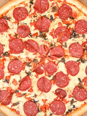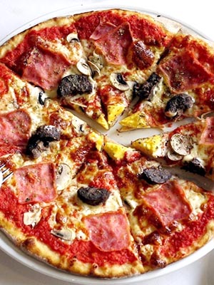 Pizza au salami, au porc bouilli et aux champignons marinés.