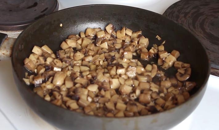 - Farce: coupez la saucisse en petits cubes et faites-la frire, hachez-la aux champignons, hachez-la finement, hachez les concombres, râpez le fromage sur une râpe grossière.