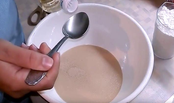 Pour préparer des pizzas faites maison selon cette recette, vous devez dissoudre la levure et le sucre dans de l’eau chauffée, et les mettre au chaud pendant 25 minutes.