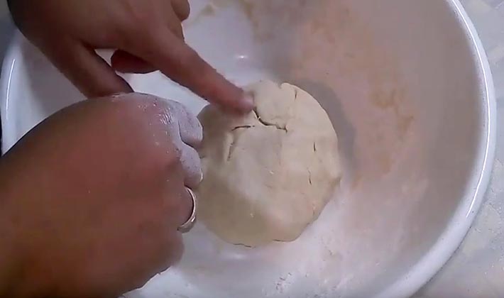 Abaisser la pâte finie en couche fine, déposer sur une plaque à pâtisserie graissée, aplatir et faire des petits côtés sur les bords.