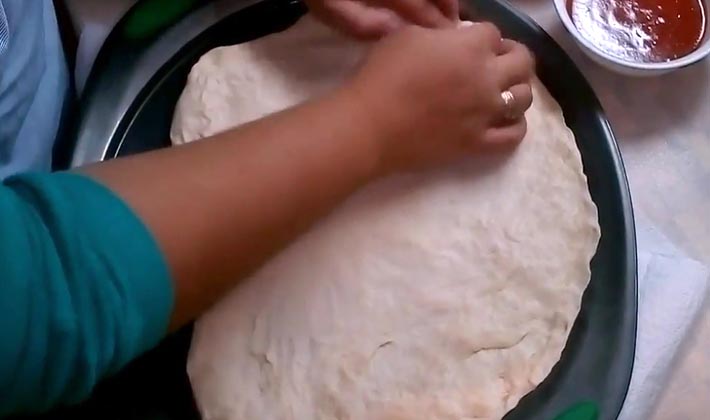 Pour préparer cette délicieuse pizza, vous devez tamiser la farine, ajouter le sel, le sucre, la levure sèche, mélanger, ajouter de l'eau tiède et de l'huile d'olive mélangées dans un récipient séparé. Mélangez bien jusqu'à consistance lisse. Couvrir la masse obtenue avec une serviette et mettre dans un endroit chaud pendant 30 minutes.