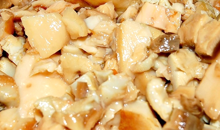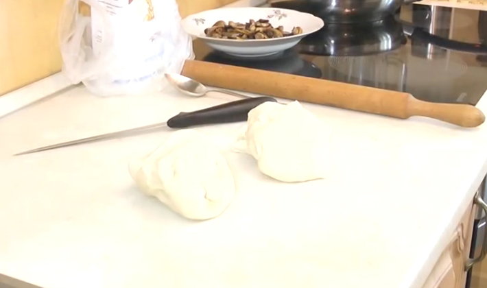 - Faites frire 300 g de champignons hachés avec l'oignon haché dans le beurre, pendant 10-15 minutes maximum. Le mélange obtenu est soigneusement placé sous une forme refroidie sur la pièce.