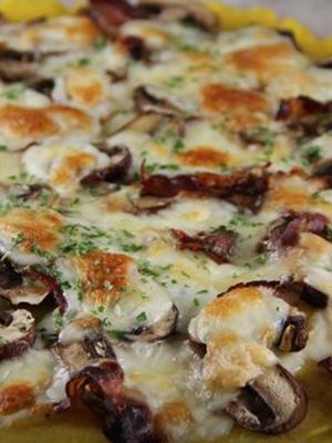 - Placez le mélange de champignons obtenu sur le jambon et saupoudrez le tout de 150 à 200 g de fromage à pâte dure râpé.