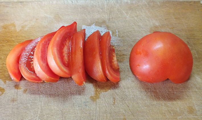 - La couche suivante est constituée de 300 g de saucisse, découpée en rondelles, sur laquelle reposent des tranches de 2 tomates.