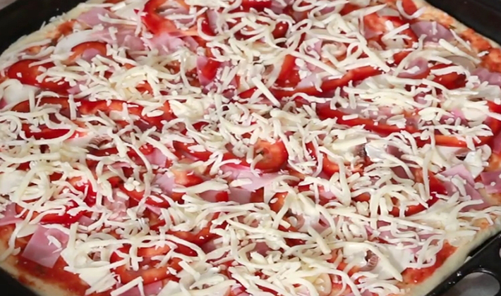 - Lubrifiez la surface de la pâte avec une sauce refroidie et déposez 400 g de jambon finement tranché.