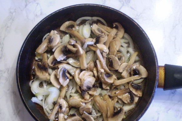 Faites frire les oignons émincés dans l'huile végétale, ainsi que les champignons coupés en dés.