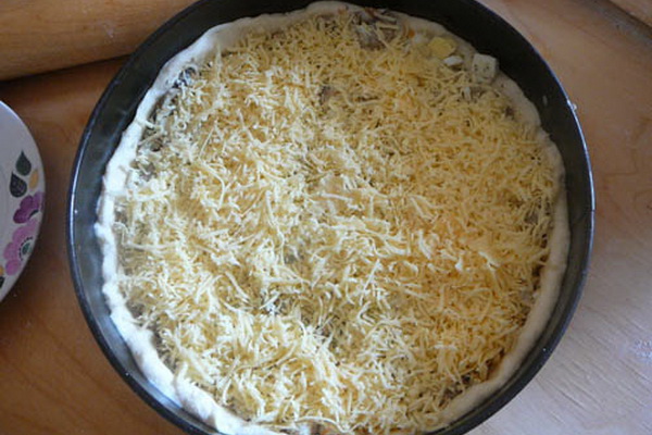 Faites un trou avec un cure-dent pour évacuer la vapeur et faites cuire à 190 ° C pendant 35 à 40 minutes. 20 minutes avant la fin du processus, graissez le gâteau de levure en couches avec des champignons et un œuf.