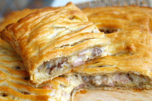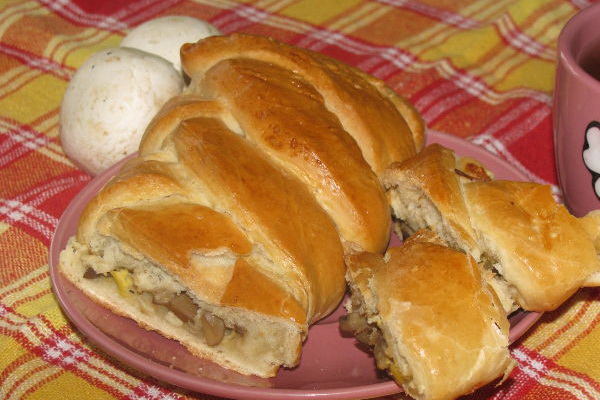 Nous continuons à cuire des chefs-d’œuvre de la pâte d’achat finie. Donc, nous suggérons cette fois d'utiliser l'option d'une tarte aux champignons de la pâte à levure feuilletée.