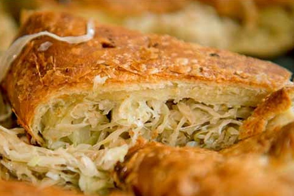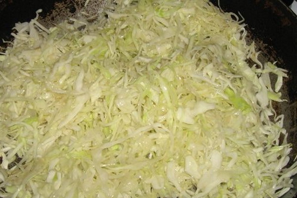 Hachez le chou, faites-le frire dans l'huile jusqu'à ce qu'il soit ramolli et ajoutez l'oignon coupé en rondelles. Ils s'étouffent sous un couvercle fermé pendant environ 20 minutes.
