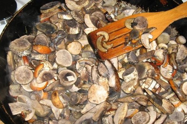 Dans le beurre, faites frire les oignons jusqu'à ce qu'ils deviennent transparents, ajoutez les champignons coupés en dés et faites frire pendant 20 minutes à feu moyen.