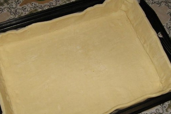 La pâte est divisée, une moitié est déposée sur une plaque à pâtisserie et déroulée en soulevant les côtés.
