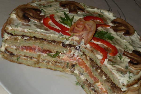 Dans ce mode de réalisation, la tarte "Napoléon" avec viande et champignons est une excellente salade d’apéritif.