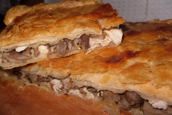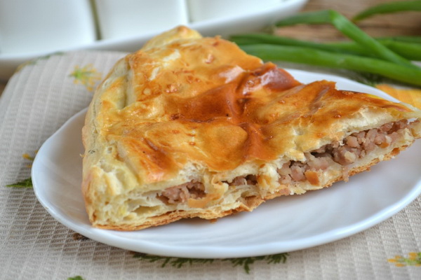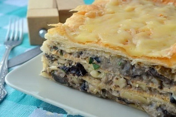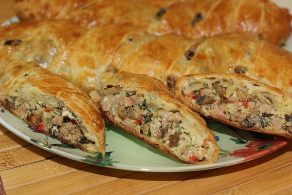 Dans cette version avec viande de porc, essayez de préparer une tarte feuilletée avec de la viande et des champignons. Le goût est excellent et votre ménage, et en particulier les hommes, apprécieront le chef-d'œuvre culinaire.