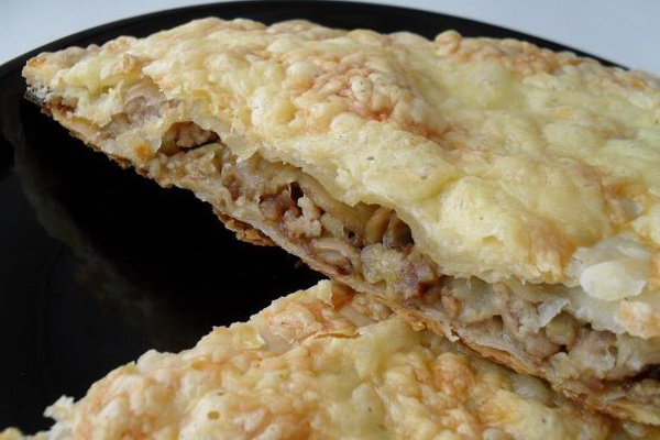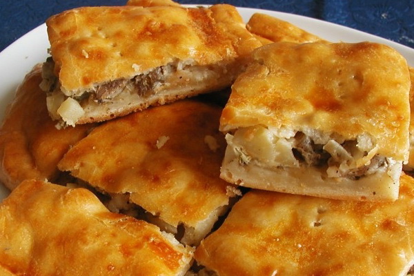 On obtient des pâtisseries particulièrement savoureuses et juteuses avec de la viande et des champignons lorsque le gâteau est laissé cru pendant un certain temps, puis seulement dans un four chaud. Notez que les tartes peuvent être servies chaudes ou froides.