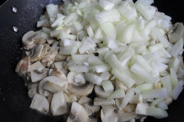 Les champignons, les oignons et la viande hachée doivent être frits dans l'huile jusqu'à ce qu'ils soient dorés.
