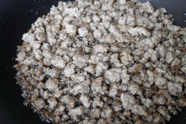 Farcir la viande hachée dans de l'huile végétale, ajouter 100 ml d'eau et laisser mijoter jusqu'à ce que le liquide s'évapore.