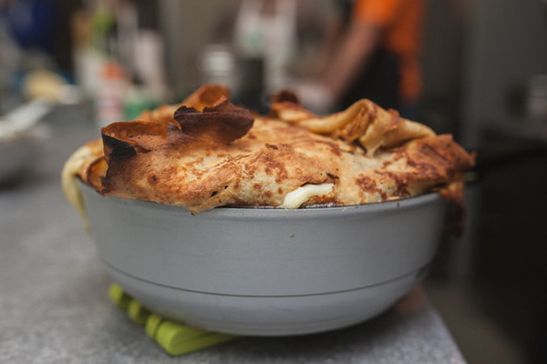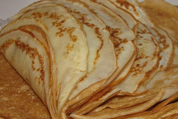 Incorporer la pâte et cuire les pancakes minces dans une casserole sèche.