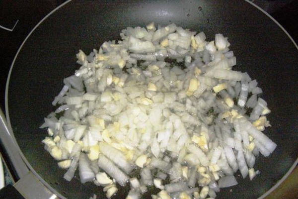 Faire frire l'oignon haché dans une poêle à frire dans l'huile chaude pendant 5 à 7 minutes.