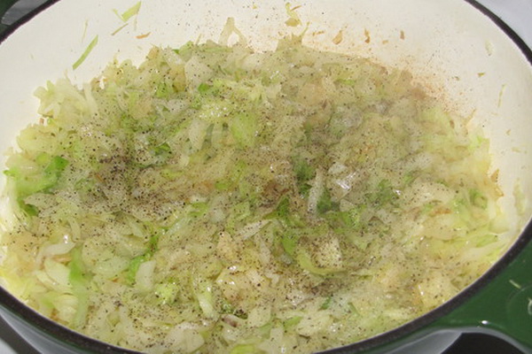 Hachez le chou finement, ajoutez l'oignon et faites-le frire 10 minutes à feu moyen-vif.