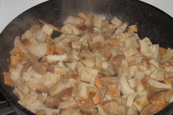 Dans ce mode de réalisation, la garniture pour la tarte aux champignons salés est très simple: chaque ingrédient est frit séparément dans une casserole, puis combiné.
