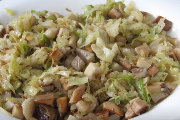 Lavez les champignons du sel, égouttez-les bien et coupez-les en cubes. Mettre dans le chou et laisser mijoter ensemble pendant 10-15 minutes.