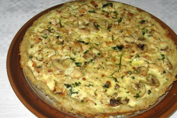 Dans la recette pour une tarte aux champignons et pommes de terre salés, vous pouvez apporter des modifications et ajouter de l'oignon à l'ail dans la garniture, ce qui rendra le plat plus savoureux.