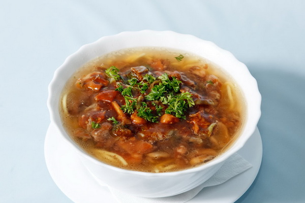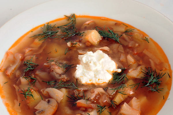 La recette de soupe maigre aux champignons peut être légèrement modifiée en ajoutant 100 g de pâte de tomate. Elle donnera au plat une couleur rougeâtre et en modifiera légèrement le goût.