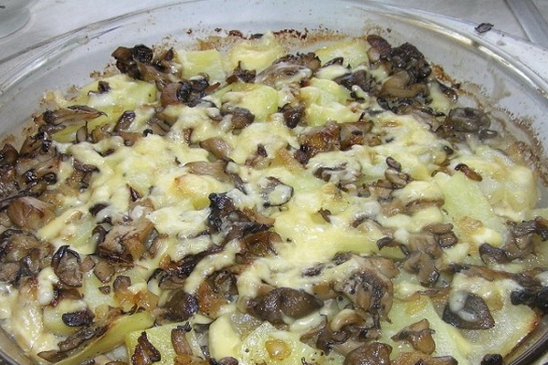Cela ressemblera à ceci: d'abord une couche de pommes de terre, puis des champignons avec des oignons et encore une répétition des couches des ingrédients disponibles. Notez que chaque couche de pommes de terre doit être saupoudrée de fromage à pâte dure râpé.