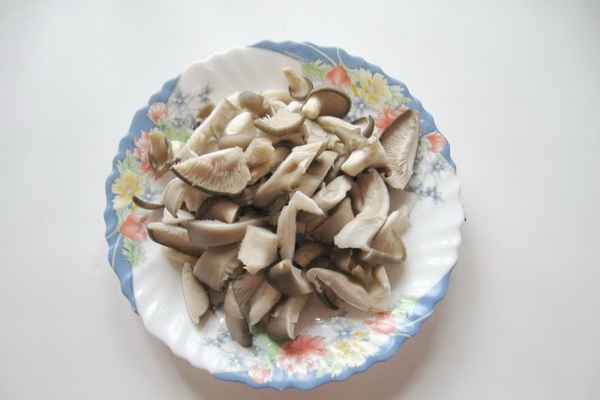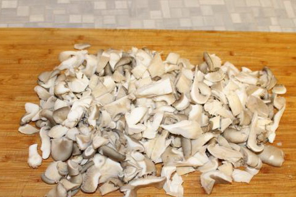 Il est bon de nettoyer les champignons pleurotes du mycélium, de les diviser en champignons séparés, de les essuyer avec une éponge humide et de les couper en gros cubes.