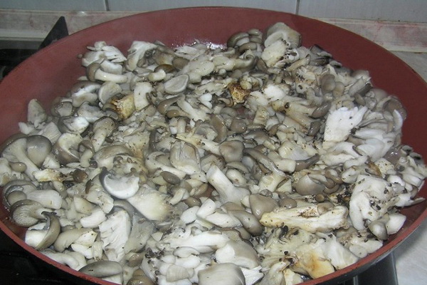 Séparez les pleurotes, coupez la partie inférieure de la jambe, rincez à l'eau courante et coupez en cubes de taille moyenne. Faire frire dans l'huile jusqu'à ce que doré et mettre dans un bol séparé.