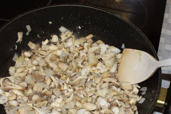 Verser plus d'huile végétale dans la poêle, ajouter l'oignon coupé en rondelles et faire frire pendant 5 minutes jusqu'à tendreté. À l'aide d'une cuillère perforée, sélectionnez des oignons sans huile et envoyez-les aux champignons.