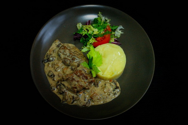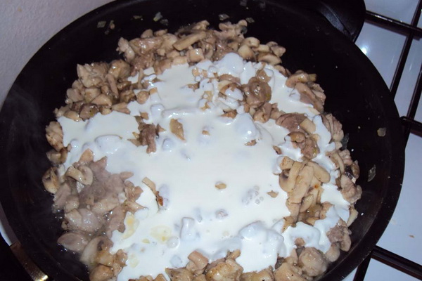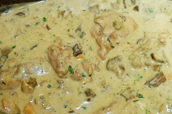 Garnir de champignons, saler, poivrer, verser la sauce à la crème sure.