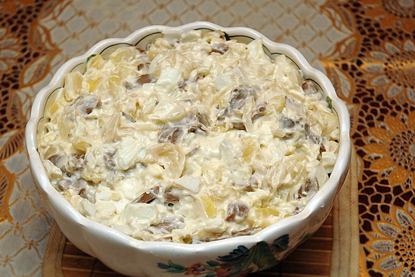 Mélangez les oignons frits, les haricots bouillis et la viande, ajoutez des concombres marinés hachés et assaisonnez avec de la mayonnaise.
