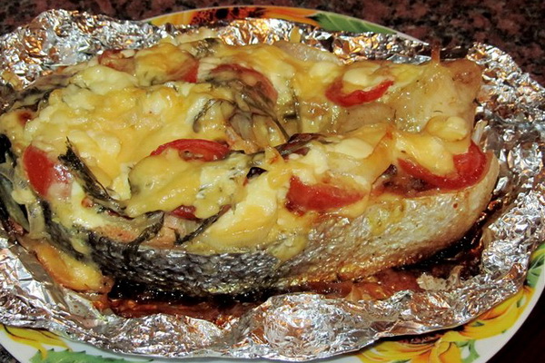 Sur le filet, mettre par tranches de tomates en tranches, de champignons et de persil finement haché, de tranches de fromage en tranches, ajouter de l'eau et la crème sure.