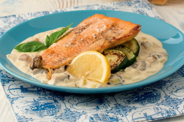 Saumon rose aux courgettes à la sauce aux champignons