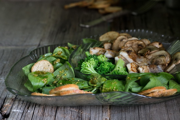 Faites attention à la photo - poisson aux champignons servi avec de la laitue: