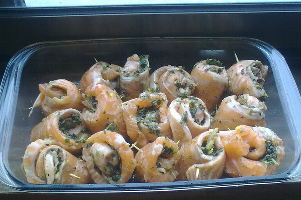 Mettre la garniture sur le filet de poisson, rouler avec des petits pains, hacher avec des brochettes si nécessaire. Cuire au four préchauffé à 175 ° C pendant 10 minutes.