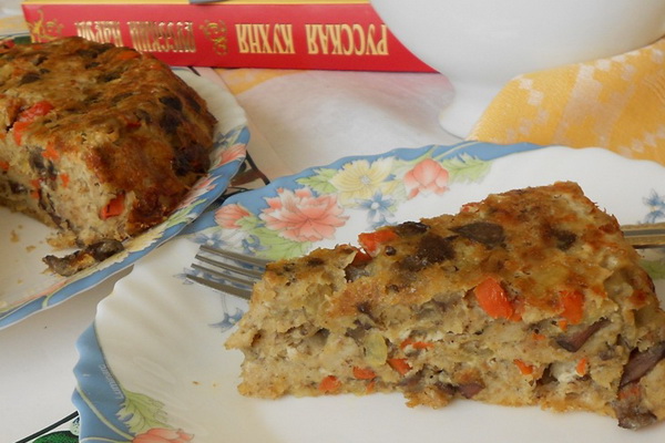 7-10 champignons séchés, 2,5 kg de filet de merlu, 2-3 oignons, 1 carotte, 200-300 g de pain de blé rassis, 100 g de margarine, 3 œufs durs, sel, poivre au goût.