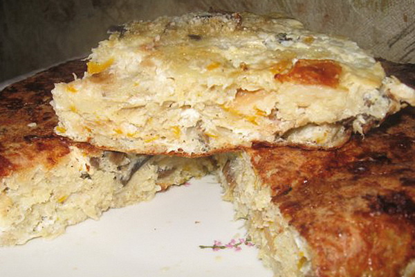 Hacher finement les oignons et les carottes, les faire frire et les combiner avec des champignons. Ajoutez deux œufs hachés à la masse refroidie.