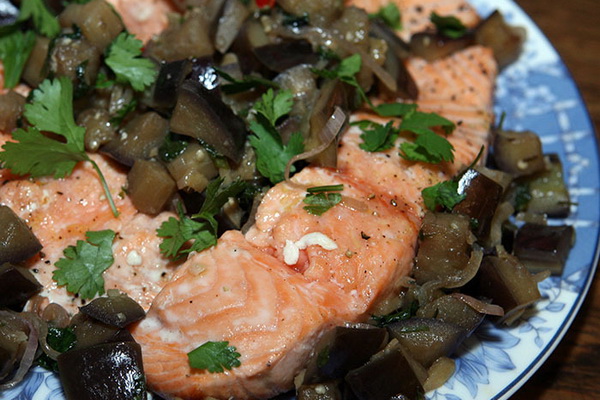 Mettez les aubergines sur une assiette, en alternant avec les champignons et les oignons, sur le dessus des morceaux de poisson. Verser le poisson sous le fromage avec la salsa cuite aux champignons.
