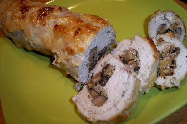 Pour cuire de la viande cuite avec des champignons et des tomates, couper le poulet en larges tranches, battre et recouvrir d'un film. Râpez avec du sel, du poivre, versez le jus de citron et l'huile d'olive, laissez pendant 20 minutes. Champignons hacher, faire frire à l'huile avec les oignons, saler, poivrer. Couper le jambon et la mozzarella en petits cubes. Râpez le fromage à pâte dure. Battez l'oeuf avec un peu de sel et mélangez-le au fromage râpé. Sur le bord de la côtelette de poulet, déposez un peu de champignons sautés, superposez les bâtonnets de jambon et de mozzarella et répartissez la masse d'œufs et de fromage. Rouler le filet sur un rouleau, attacher avec des fils, faire frire dans l'huile des deux côtés jusqu'à ce qu'il soit doré (2-3 minutes de chaque côté). Ensuite, passez au four et faites cuire au four pendant 25-30 minutes à une température de 180 ° C.