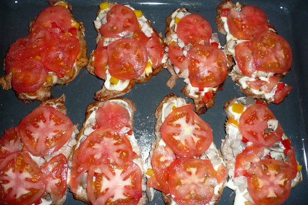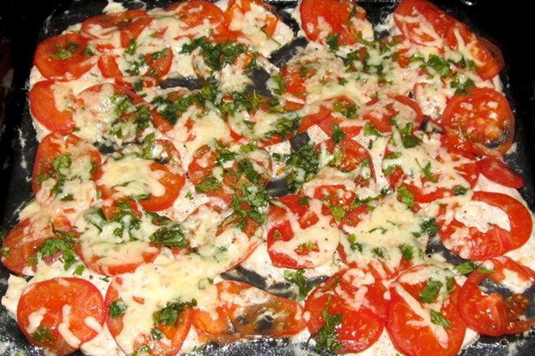 Les ingrédients700 g de poulet, 500 g de tomates, 2 oignons moyens, 300 g de champignons, 5-6 branches d'aneth, 2 œufs, 100 g de fromage à pâte dure, 4 c. l mayonnaise, 3-4 c. l farine, ⅓ tasse d'huile végétale, sel et épices au goût