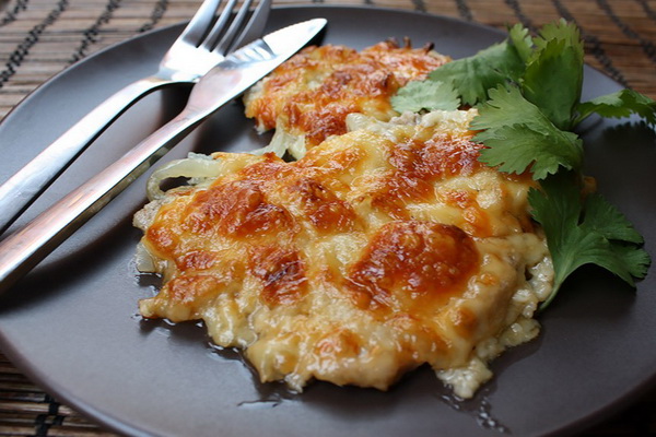 Lavez le filet, coupez-le dans le sens de la longueur, enlevez un peu, salez et poivrez. Épluchez et hachez les rondelles d'oignon, faites-les frire dans une petite quantité d'huile végétale jusqu'à ce qu'elles soient dorées. Râpez le fromage sur une râpe grossière. Lavez et hachez les tomates. Hacher les côtelettes dans la farine, les tremper dans les œufs battus et les faire revenir des deux côtés jusqu'à ce qu'ils soient dorés. Graisser le plat à four avec de l'huile. Étaler les côtelettes et les champignons, verser la mayonnaise, les cercles de tomates, les rondelles d'oignon, les légumes verts finement hachés et saupoudrer de fromage râpé. Cuire au four pendant 10-15 minutes à une température de 160-180 ° C. Une excellente garniture pour une côtelette de poulet à la française avec des champignons et des tomates est une purée de pommes de terre ou une salade de légumes frais.